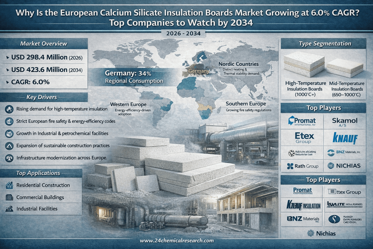 According to 24Chemical Research, European calcium silicate insulation boards market continues to demonstrate robust expansion, with its valuation reaching USD 298.4 million in 2026. According to the latest industrial analysis, the market is projected to grow at a CAGR of 6.0%, reaching approximately USD 423.6 million by 2034. This sustained growth stems from escalating demand for high-performance thermal insulation solutions across industrial and construction sectors, particularly in Germany and Western Europe where energy efficiency mandates are driving adoption.