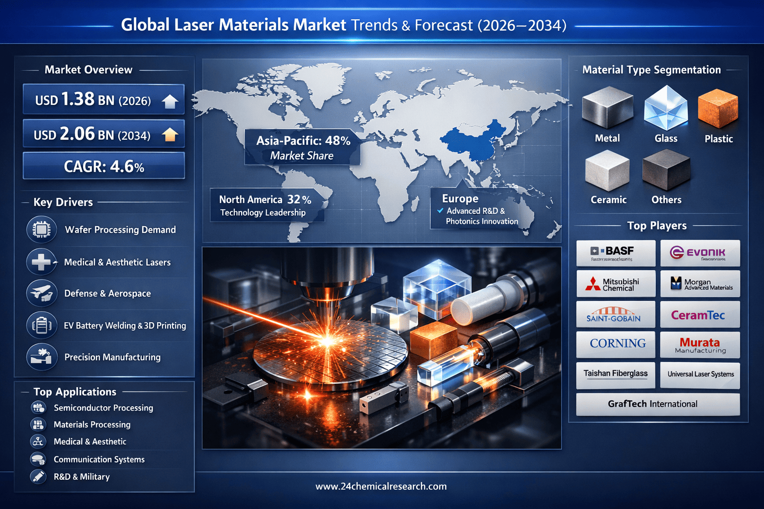 This comprehensive analysis examines the global laser materials landscape from 2024-2032, providing: