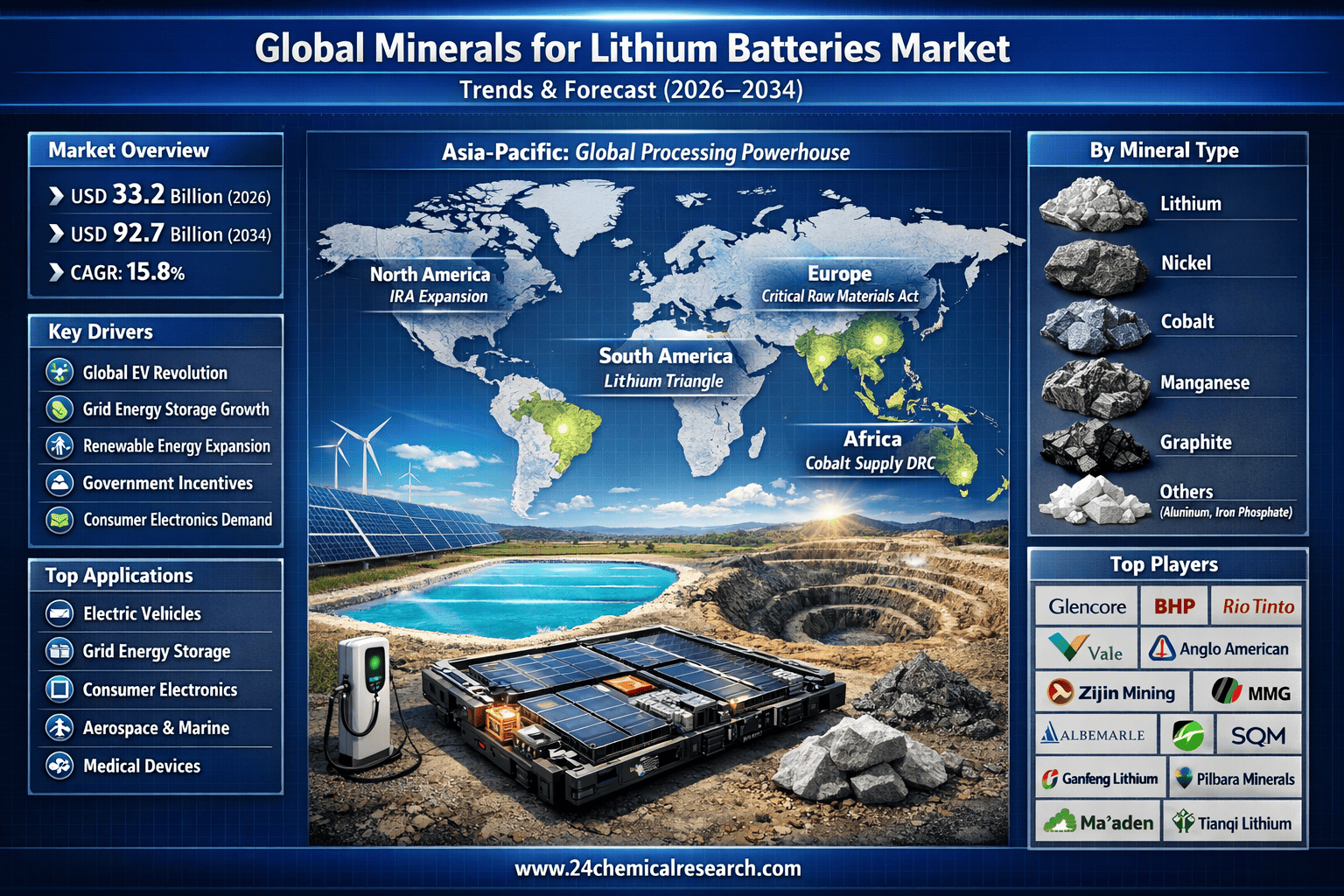 According to 24Chemical Research, Global Minerals for Lithium Batteries market size was valued at USD 28.5 billion in 2025. The market is projected to grow from USD 33.2 billion in 2026 to USD 92.7 billion by 2034, exhibiting a CAGR of 15.8% during the forecast period.