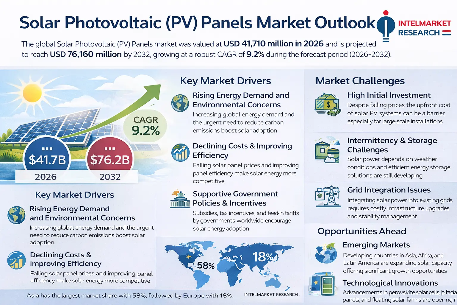 According to a new report from Intel Market Research, Global Solar Photovoltaic (PV) Panels market was valued at USD 41,710 million in 2025 and is projected to reach USD 76,160 million by 2032, growing at a robust CAGR of 9.2% during the forecast period (2026-2032). This growth is propelled by the increasing global demand for clean energy, supportive government policies, declining solar panel prices, and growing environmental consciousness worldwide.