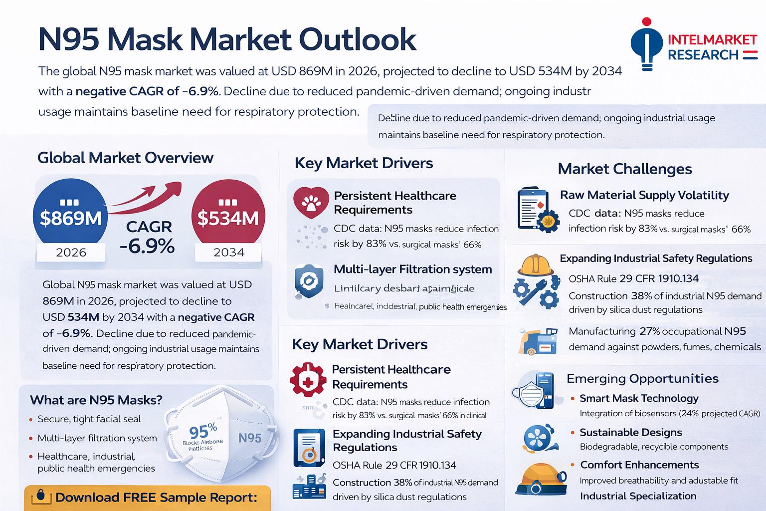 According to a new report from Intel Market Research, Global N95 mask market was valued at USD 869 million in 2025 and is projected to decline to USD 534 million by 2034, exhibiting a negative CAGR of -6.9% during the forecast period (2026-2034). This market contraction reflects reduced pandemic-driven demand while sustained industrial usage maintains baseline need for respiratory protection.