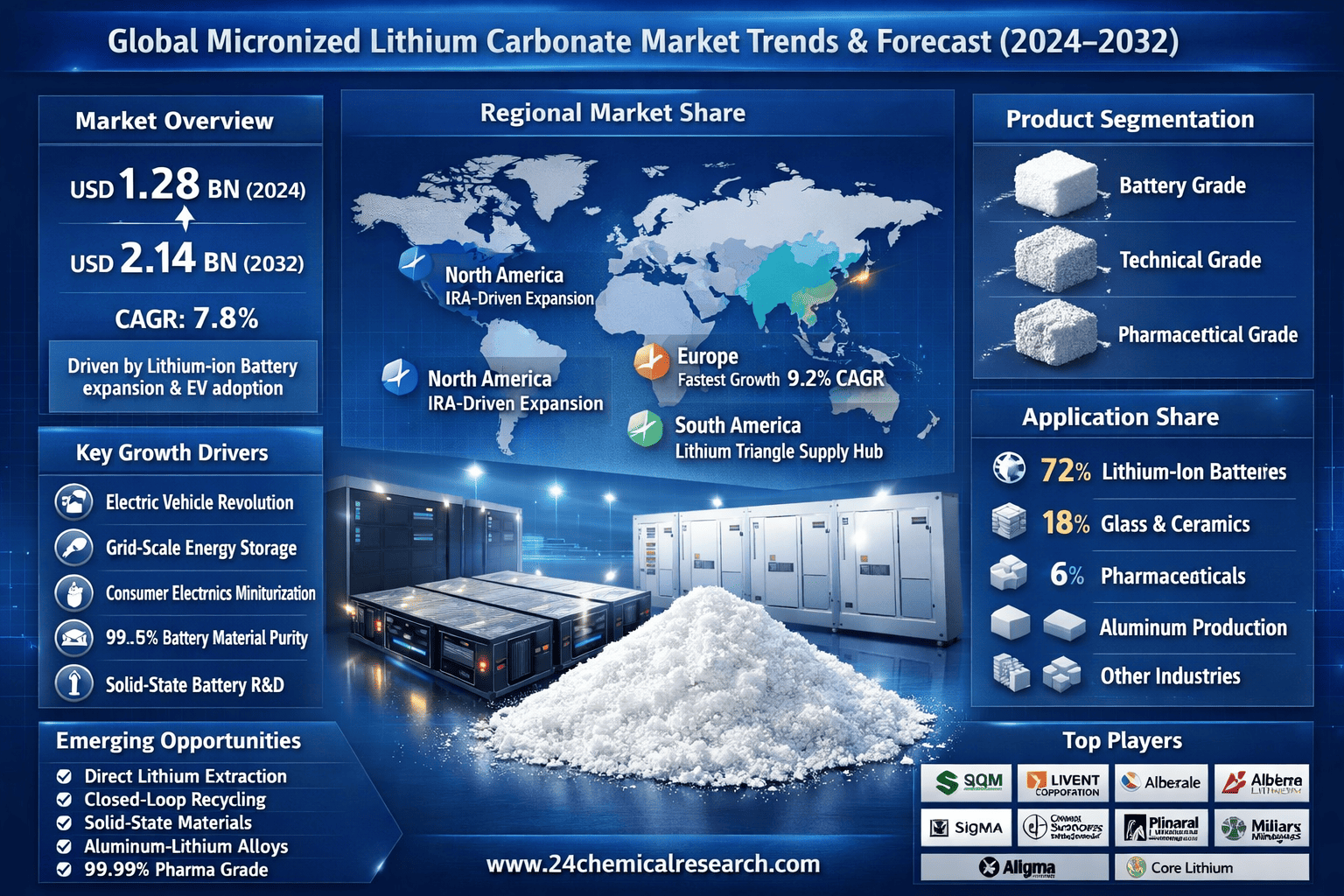 The micronized lithium carbonate market is being transformed by three powerful forces: the electric vehicle revolution, grid-scale energy storage deployments, and consumer electronics miniaturization. Battery applications now account for 72% of global demand, followed by glass/ceramics (18%) and pharmaceuticals (6%). New growth frontiers are emerging in solid-state battery electrolytes and lightweight aluminum-lithium alloys for aerospace.