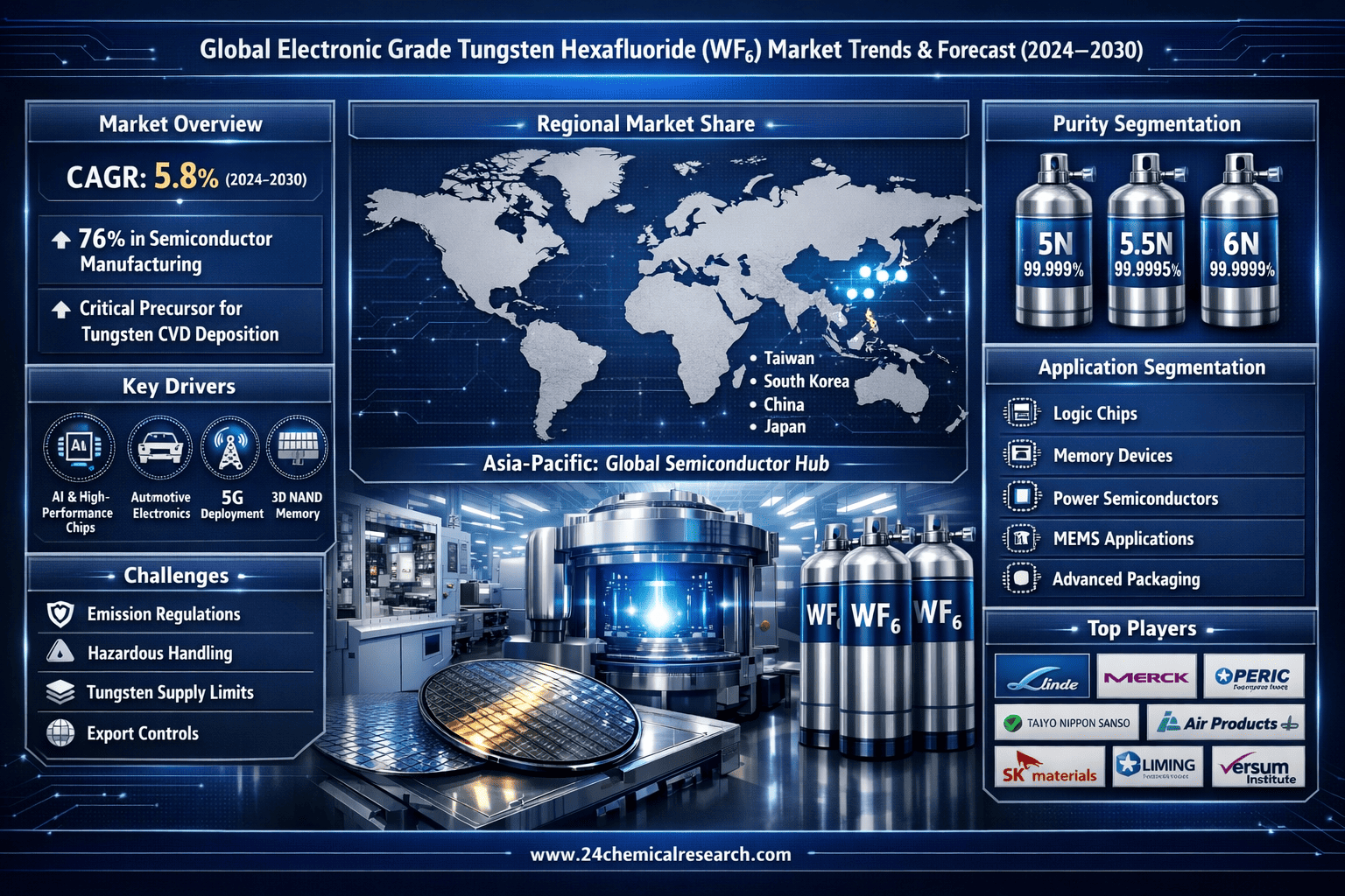 Global Electronic Grade Tungsten Hexafluoride (WF6) market continues to demonstrate steady growth, projected to expand at a CAGR of 5.8% from 2024 to 2030. This specialty chemical plays a critical role in semiconductor manufacturing, where 76% of global WF6 consumption occurs for depositing tungsten interconnects in advanced chip architectures. With the semiconductor sector experiencing unprecedented demand for logic and memory chips, WF6 adoption is accelerating across foundries and IDMs worldwide.
