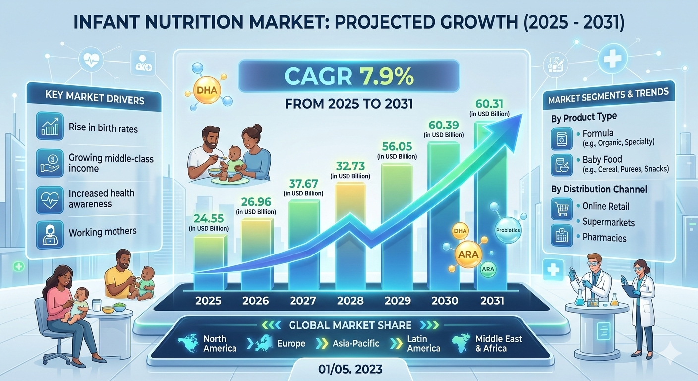 The Infant Nutrition Market is experiencing sustained growth as parents increasingly prioritize scientifically formulated nutrition for early childhood development. Rising health awareness and innovation in nutrient delivery are strengthening product adoption across global markets. The industry is projected to grow at a CAGR of 7.9% from 2025 to 2031, expanding from US$ XX million in 2024 to US$ XX Million by 2031.
