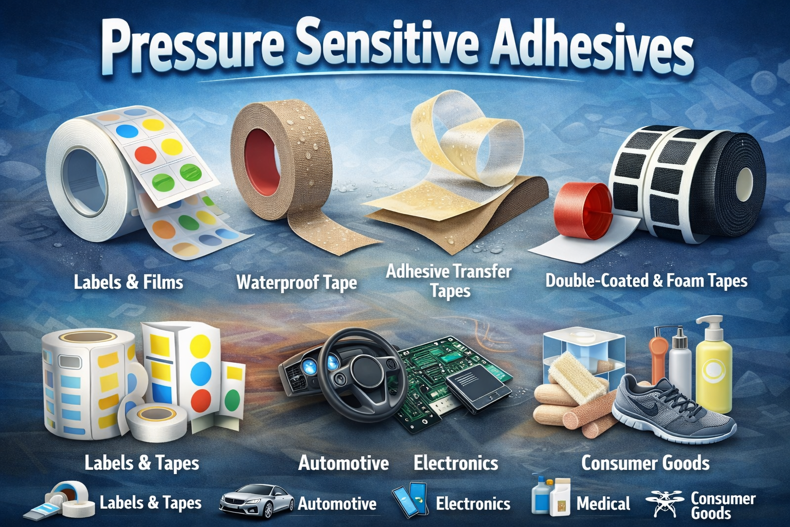 Pressure sensitive adhesives are primarily used in automotive, packaging, medical, electronics, and consumer goods industries.