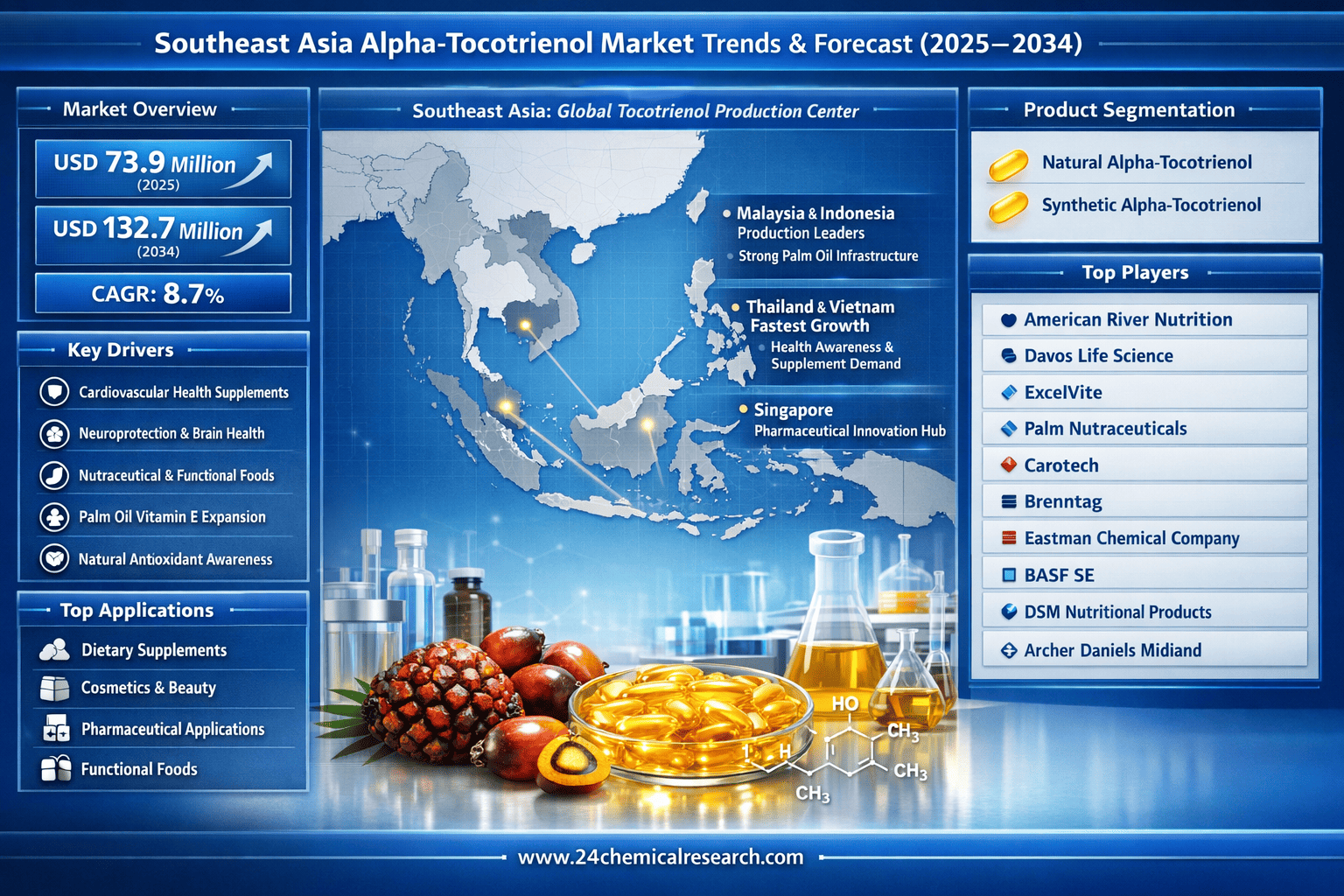 According to 24Chemical Research, Southeast Asia Alpha-Tocotrienol market size was valued at USD 73.9 million in 2025 and is projected to reach USD 132.7 million by 2034, exhibiting a CAGR of 8.7% during the forecast period.