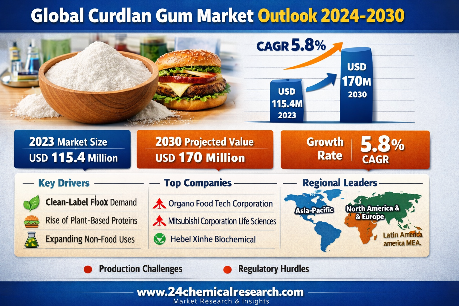 Global Curdlan Gum Market was valued at USD 115.4 million in 2023 and is projected to reach USD 170 million by 2030, exhibiting a solid CAGR of 5.8% during the forecast period.