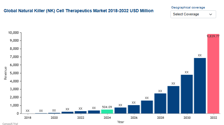 The oncology landscape is shifting toward more sophisticated, "off-the-shelf" cellular interventions that leverage the body’s innate immune system. The Natural Killer (NK) Cell Therapeutics Market was valued at USD 504.09 million in 2024 and is projected to skyrocket to USD 9,839.77 million by 2032, growing at an extraordinary CAGR of 109.97% during the forecast period of 2025 to 2032. This hyper-growth is driven by the potential for NK cells to provide a safer alternative to CAR-T therapies, with a lower risk of cytokine release syndrome (CRS) and graft-versus-host disease (GvHD).