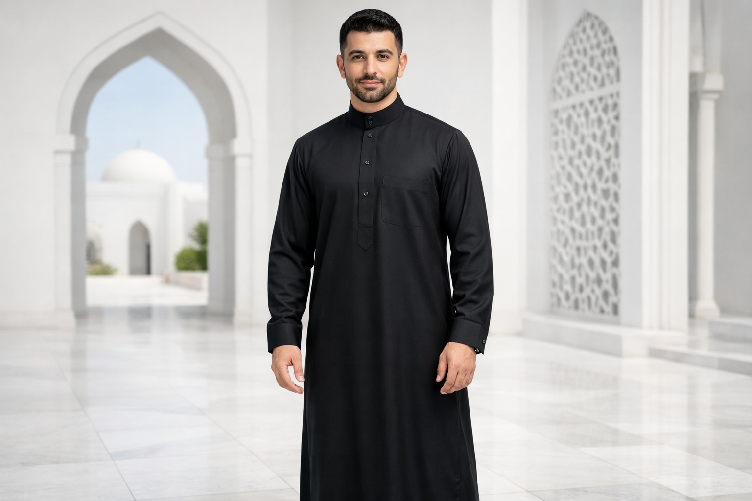 • The Emirati Cut: Known for being collarless and featuring a long tassel (tarboosh), this style offers a more relaxed yet elegant look. In black, the Emirati style looks very modern and minimalist.