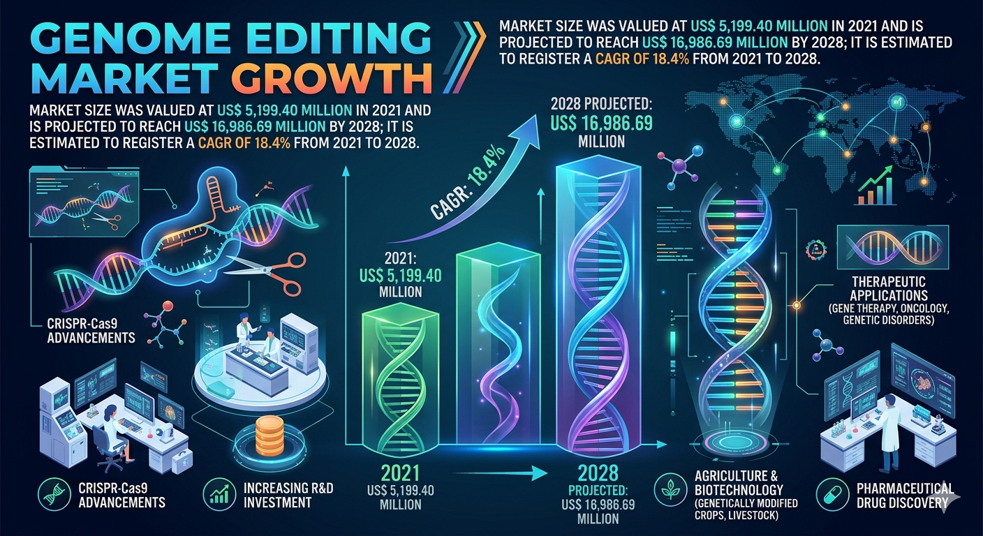 According to the study published by The Insight Partners, the global genome editing market was valued at US$ 5.19 billion in 2021 and is projected to reach US$ 16.98 billion by 2028, growing at a CAGR of 18.4% during the forecast period (2021–2028). The market’s strong growth trajectory is mainly attributed to increasing research investments, technological advancements in gene editing tools, and expanding applications of genome editing technologies in healthcare and biotechnology sectors.