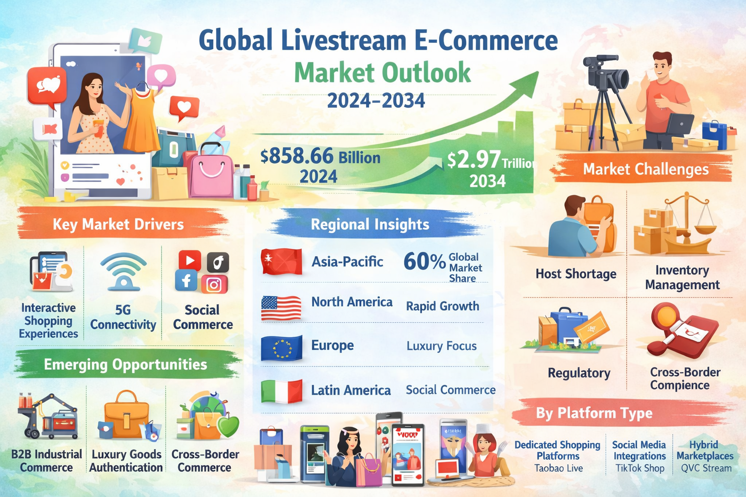 - Regulatory Uncertainty - As live selling gains traction, governments globally are developing new compliance frameworks for product claims, return policies, and data privacy in streaming environments.