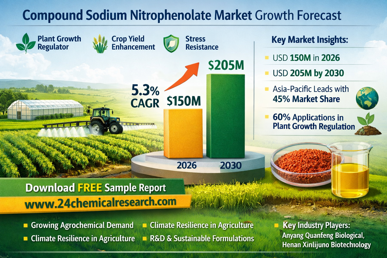 Global Compound Sodium Nitrophenolate Market is experiencing steady expansion, with a current valuation of USD 150 million in 2026 and projected growth to USD 205 million by 2030 at a CAGR of 5.3%. As a powerful plant growth regulator and cell activator, this specialized agrochemical is gaining traction across agricultural economies due to its ability to enhance crop yield and stress resistance.