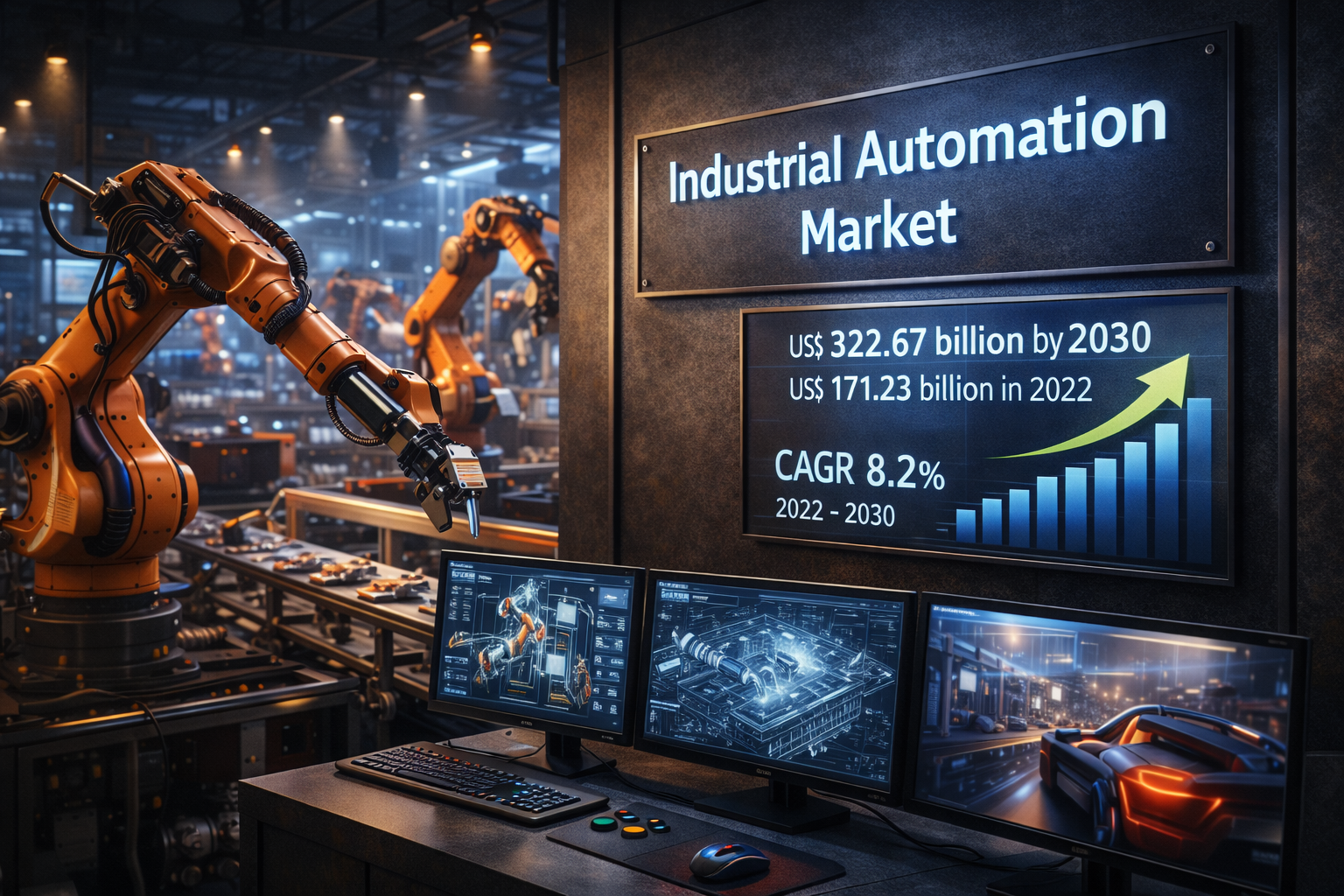 According to the global Industrial Automation Market Size was valued at US$ 171.23 billion in 2022 and is projected to reach US$ 322.67 billion by 2030, expanding at a CAGR of 8.2% from 2022 to 2030. The increasing adoption of Industry 4.0 technologies, along with the integration of artificial intelligence and machine learning into manufacturing systems, is significantly contributing to the growth of the Industrial Automation Market.