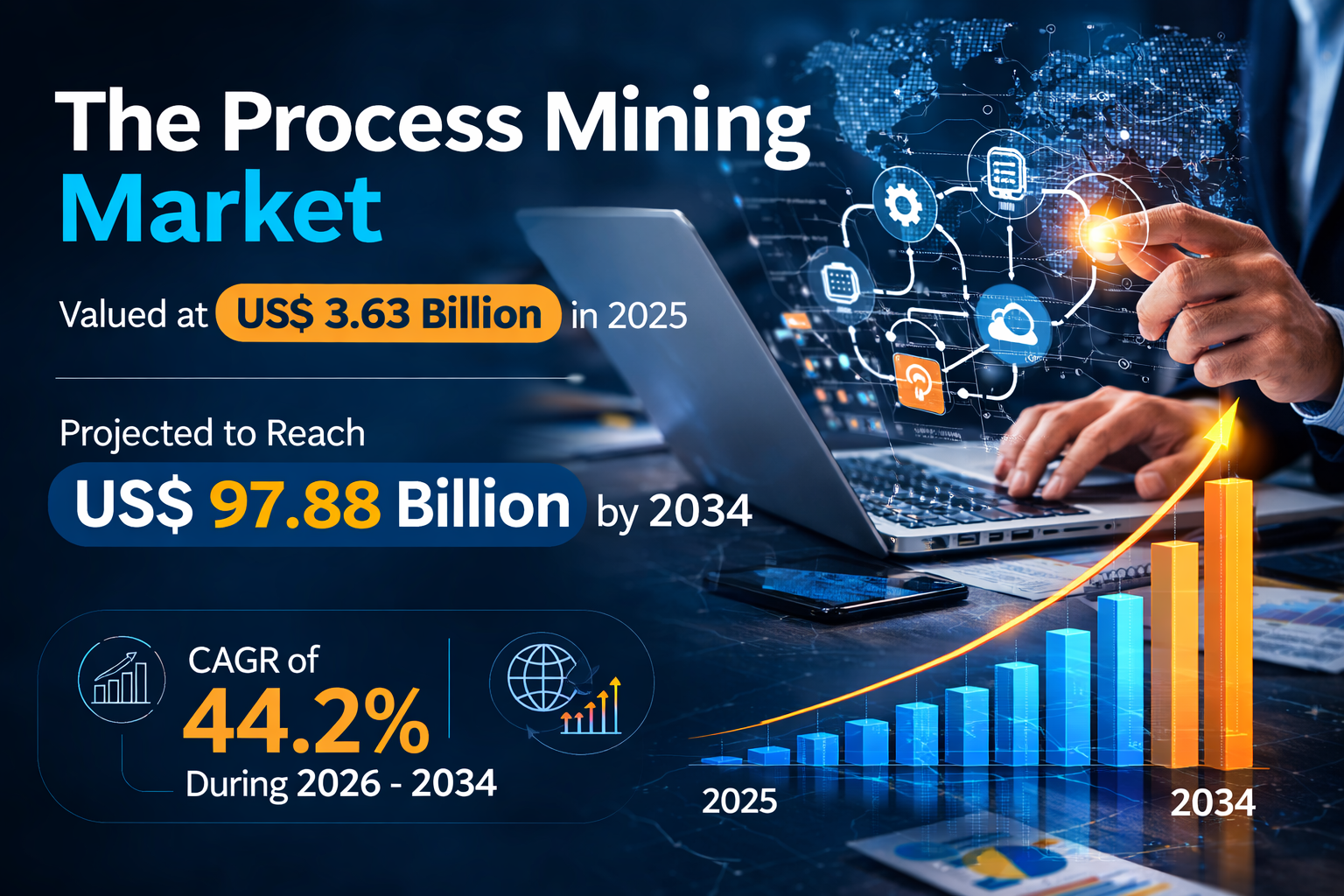 One of the most prominent factors shaping the industry is the expanding market opportunities created by the rapid digitalization of enterprises worldwide. Organizations across sectors such as banking, healthcare, manufacturing, retail, and telecommunications are increasingly implementing process mining platforms to improve operational visibility and decision-making. These opportunities are further strengthened by the growing need for real-time process monitoring, predictive analytics, and workflow optimization. As companies generate massive volumes of operational data from enterprise resource planning (ERP), customer relationship management (CRM), and supply chain systems, process mining tools are becoming essential for converting this data into actionable insights. The Process Mining Market, valued at US$ 3.63 billion in 2025, is projected to reach US$ 97.88 billion by 2034, expanding at a CAGR of 44.2% during 2026-2034.