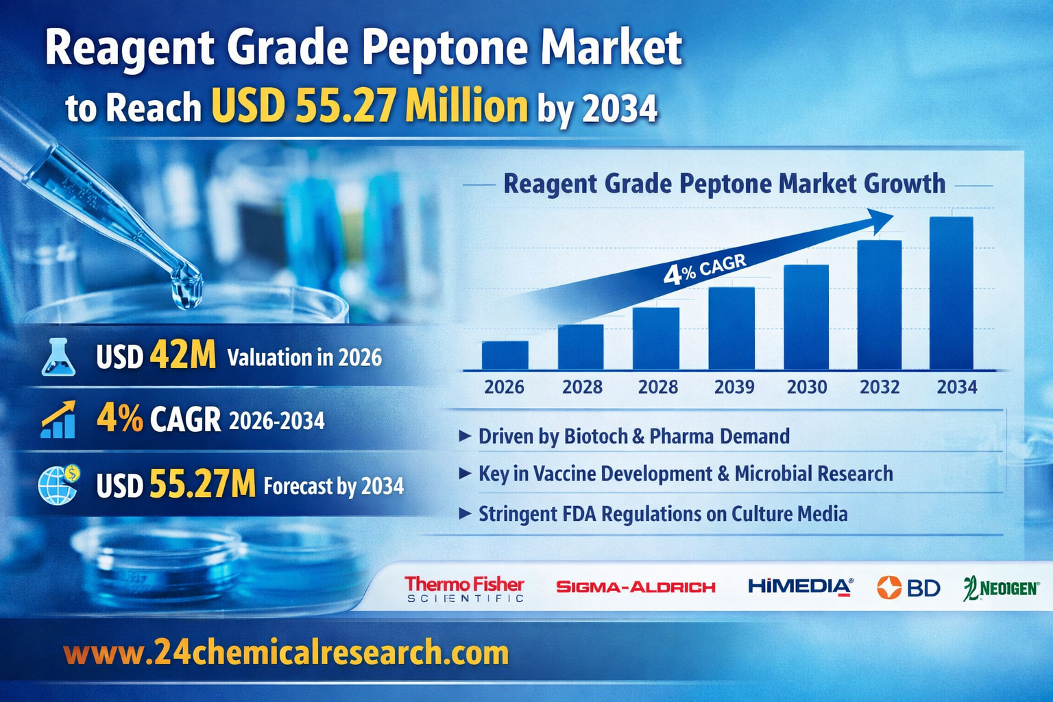 Global Reagent Grade Peptone Market is experiencing steady expansion, with its valuation reaching USD 42 million in 2026. According to comprehensive market analysis, the sector is projected to grow at a CAGR of 4%, reaching approximately USD 55.27 million by 2034. This growth trajectory reflects increasing demand from microbiology research, pharmaceutical production, and biotechnology applications where high-purity nutrient media are essential.