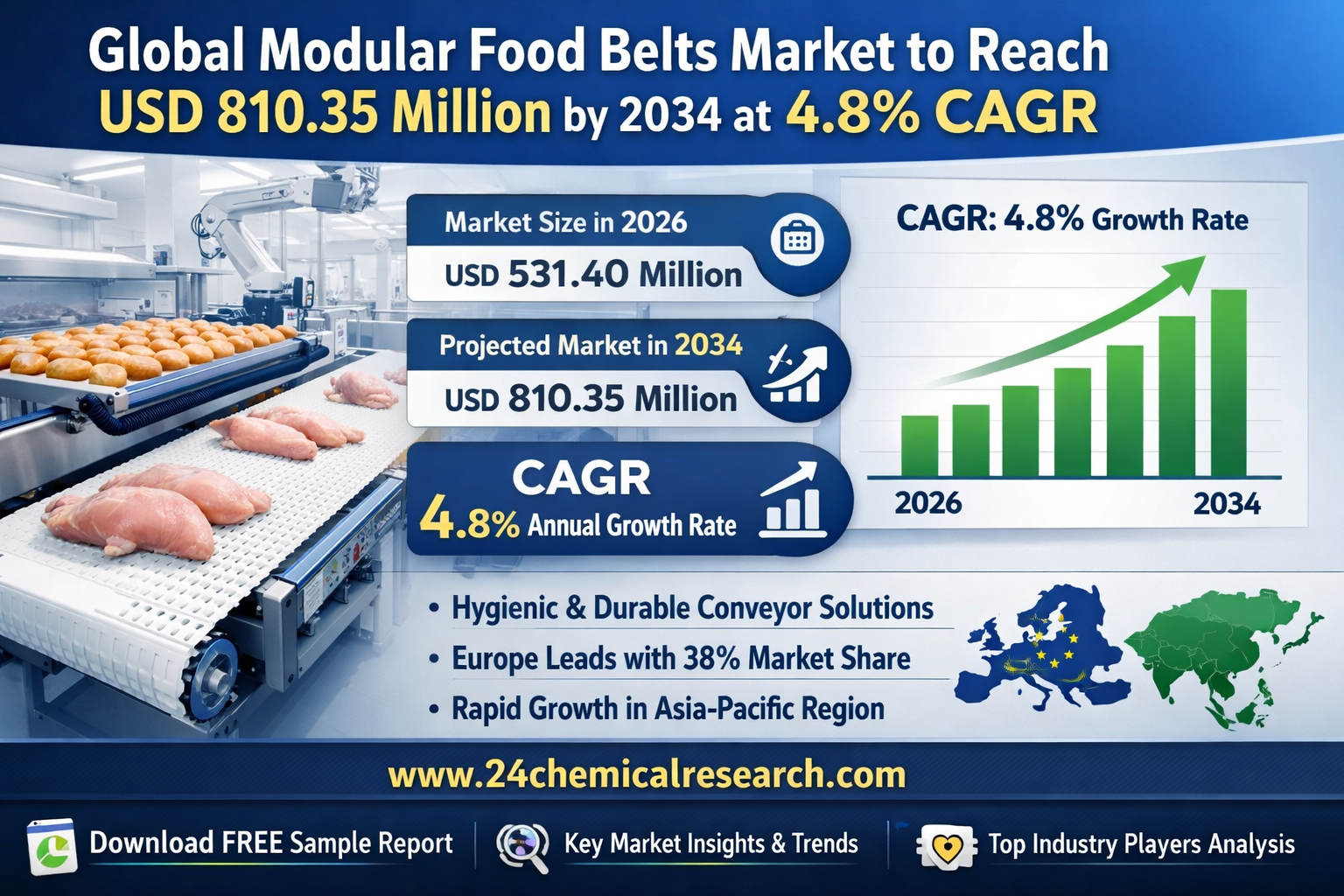 Global Modular Food Belts Market demonstrates steady expansion, with its valuation reaching USD 531.40 million in 2026, according to comprehensive industry analysis. The market is projected to grow at a CAGR of 4.80%, reaching approximately USD 810.35 million by 2034. This growth trajectory reflects increasing adoption across food processing facilities, where hygienic material handling solutions are becoming non-negotiable for compliance with stringent food safety standards.