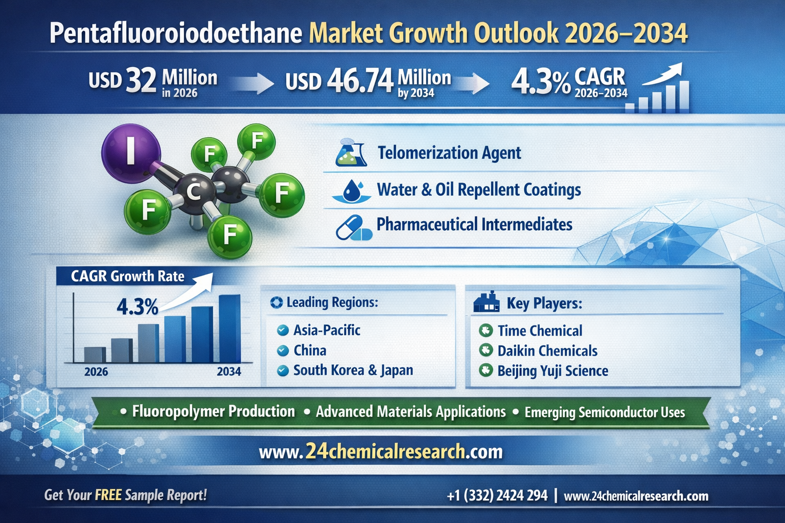 Global Pentafluoroiodoethane (CAS 354-64-3) market demonstrates steady growth, with its valuation reaching USD 32 million in 2026 according to the latest industry analysis. The market is projected to grow at a CAGR of 4.30%, reaching approximately USD 46.74 million by 2034. This specialty chemical, primarily used as an initial telomerization agent, finds extensive applications in water-repellent formulations, oil-resistant coatings, and fluorinated pharmaceutical intermediates.