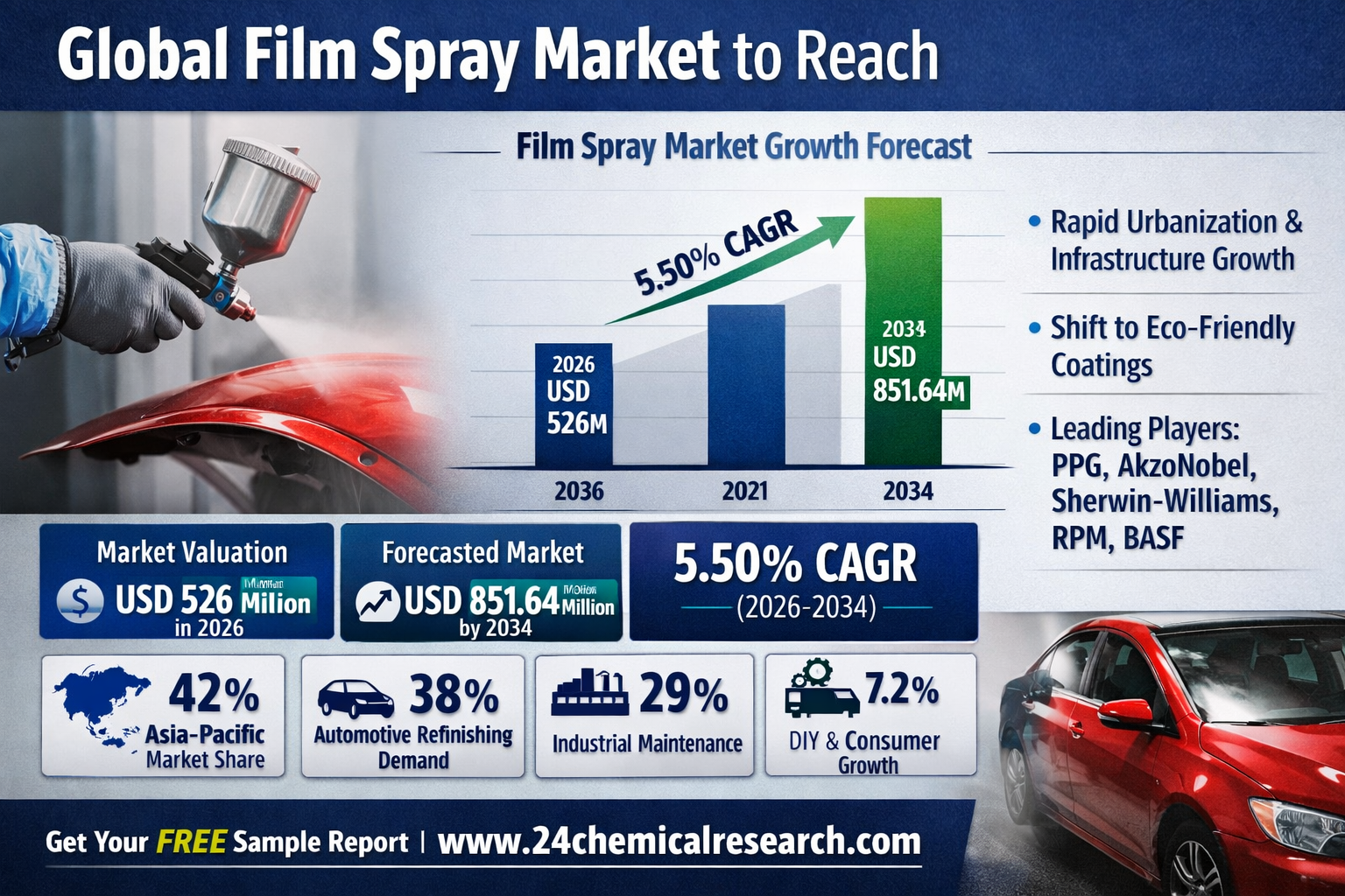 Global Film Spray market continues to exhibit robust growth, with its valuation reaching USD 526 million in 2026. Industry analysts project the market will grow at a CAGR of 5.50%, reaching approximately USD 851.64 million by 2034. This expansion is driven by increasing applications across automotive refinishing, industrial coatings, and DIY sectors, particularly in regions witnessing rapid urbanization and infrastructure development.