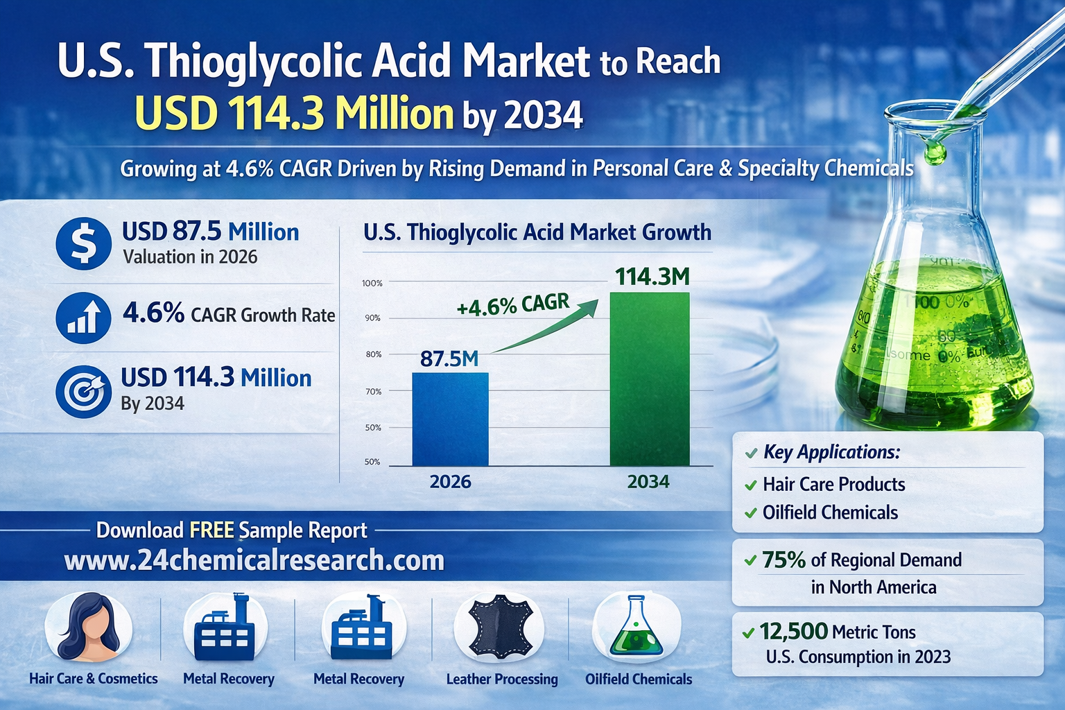 United States Thioglycolic Acid market continues to exhibit steady growth, with its valuation reaching USD 87.5 million in 2026. According to comprehensive industry analysis, the market is projected to grow at a CAGR of 4.6%, reaching approximately USD 114.3 million by 2034. This growth trajectory stems from expanding applications across personal care and industrial sectors, particularly in hair care formulations and specialty chemical applications.