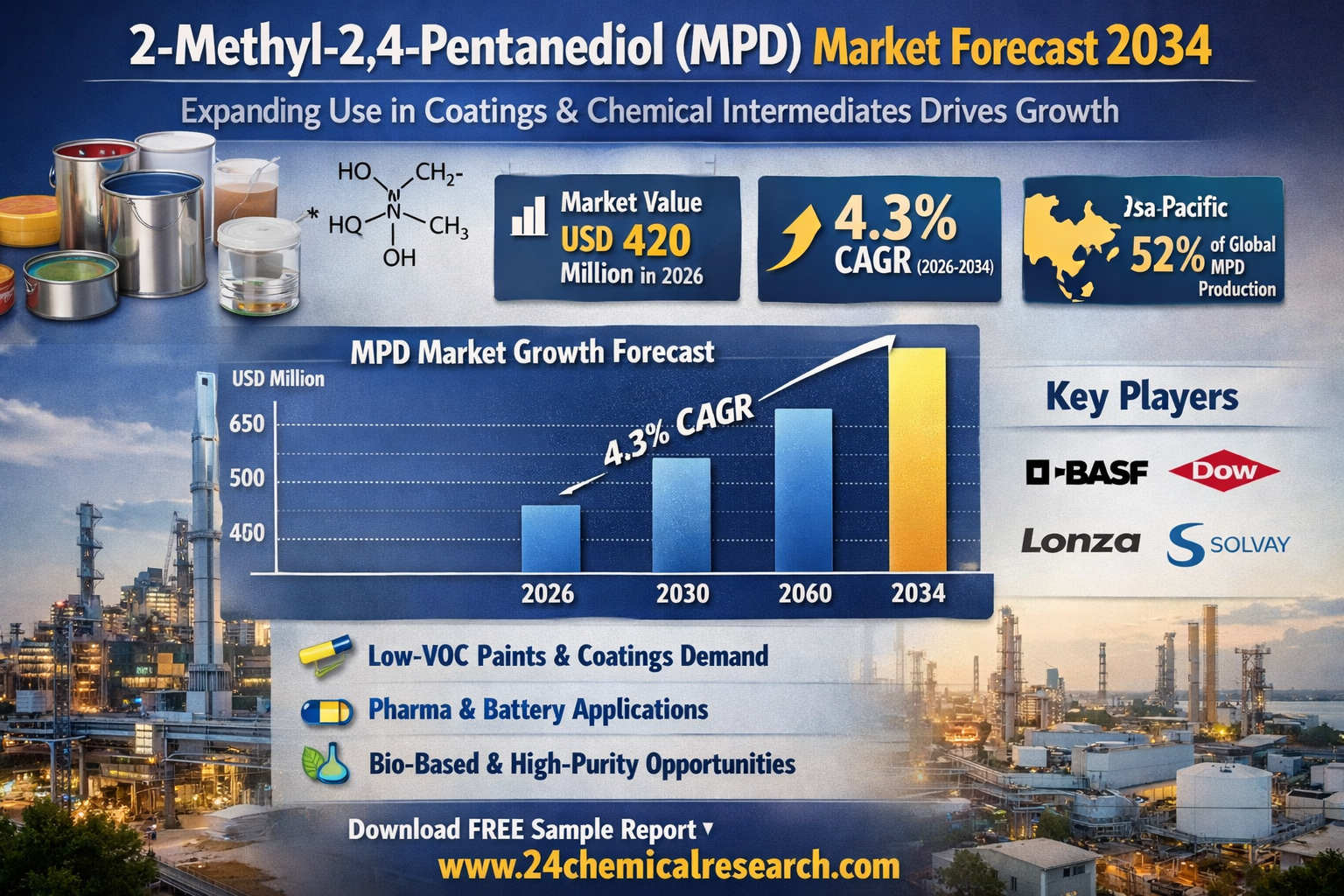 Global 2-Methyl-2,4-Pentanediol (MPD) market, a versatile solvent with applications across paints, coatings, and industrial formulations, demonstrates steady growth despite evolving regulatory landscapes. Valued at USD 420 million in 2026, the market is projected to expand at a CAGR of 4.3% through 2034, driven by increasing demand from end-use industries prioritizing high-performance chemical intermediates.