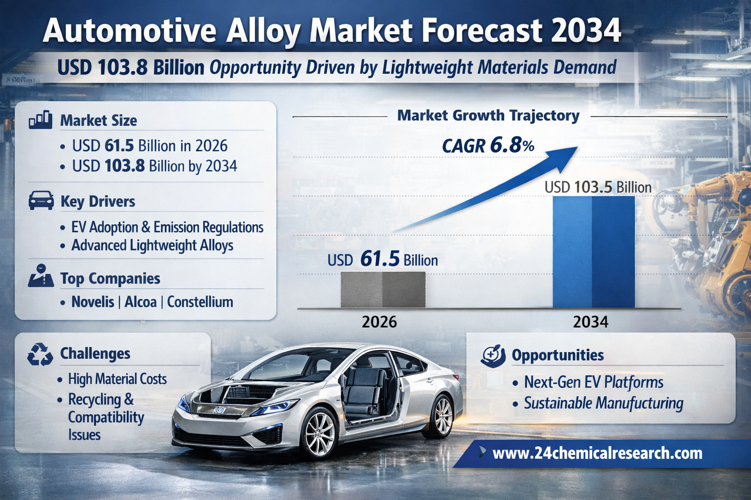 Global Automotive Alloy market was valued at USD 61.5 billion in 2026 and is projected to reach USD 103.8 billion by 2034, exhibiting a steady CAGR of 6.8% during the forecast period.