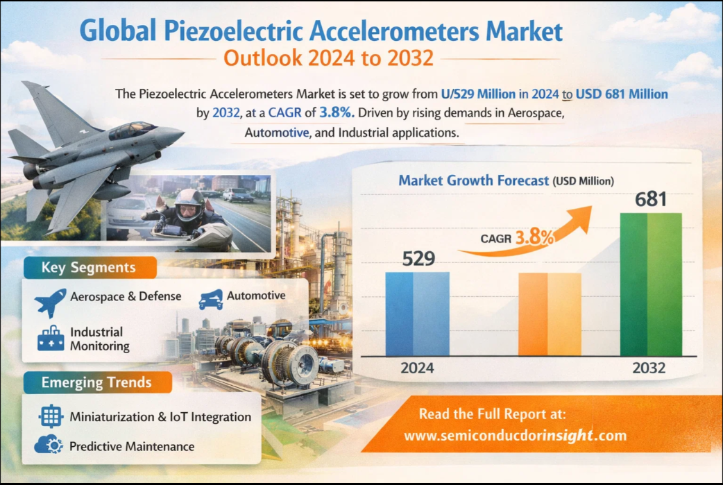 Global Piezoelectric Accelerometers Market size was valued at USD 529 million in 2024 to USD 681 million by 2032, exhibiting a CAGR of 3.8% during the forecast period. This steady expansion is documented in a detailed report launched by Semiconductor Insight. The report underscores the indispensable role these high-precision vibration sensors play in ensuring safety, reliability, and performance across various demanding sectors.