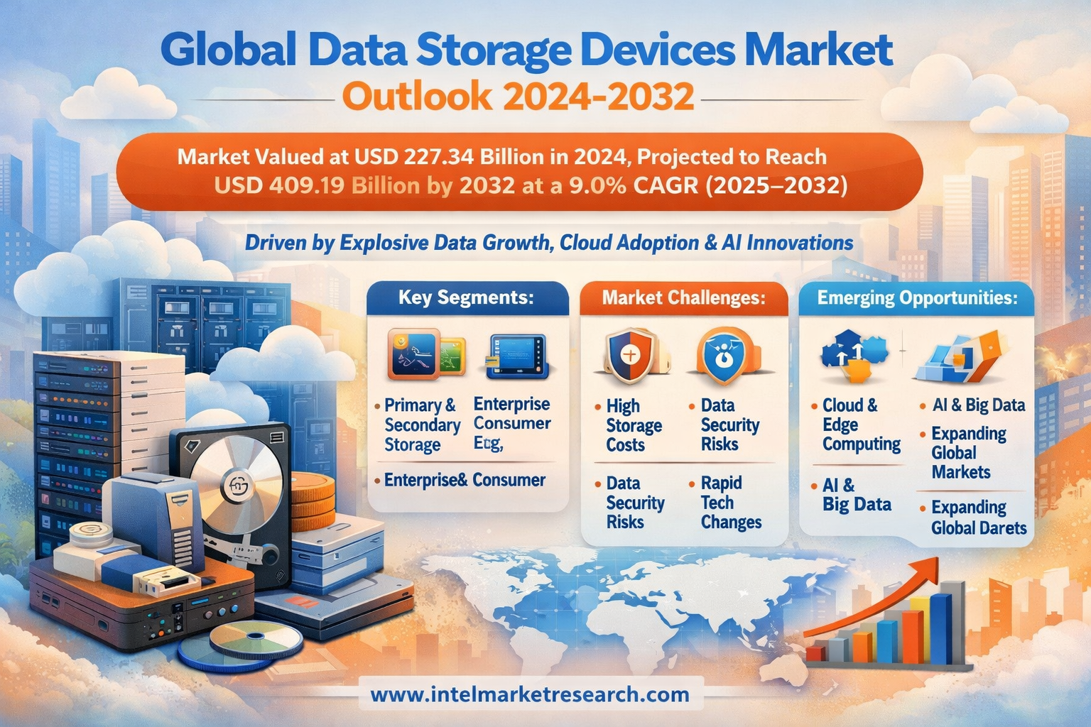 According to a new report from Intel Market Research, the global Data Storage Devices Market was valued at USD 227.34 billion in 2024 and is projected to reach USD 409.19 billion by 2032, growing at a robust CAGR of 9.0% during the forecast period (2025–2032). This substantial growth is propelled by the exponential increase in global data generation, widespread adoption of cloud computing, and the proliferation of data-intensive applications like artificial intelligence and big data analytics.