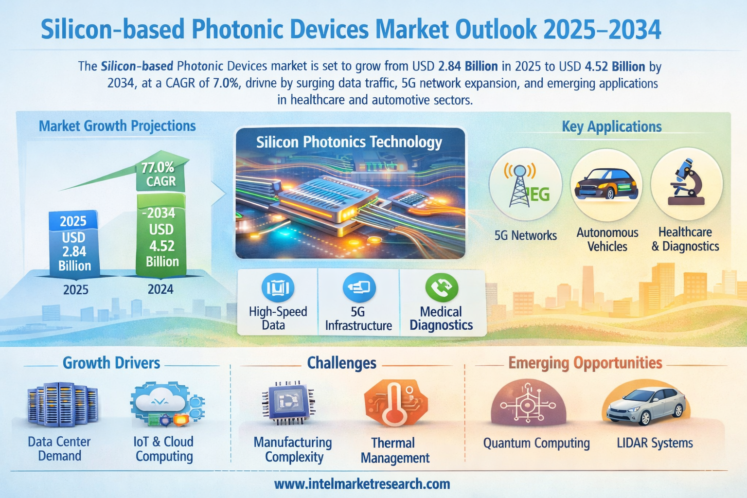 According to a new report from Intel Market Research, the global Silicon-based Photonic Devices market was valued at USD 2.84 billion in 2025 and is projected to reach USD 4.52 billion by 2034, growing at a CAGR of 7.0% during the forecast period (2025–2034). This growth is driven by surging demand for high-speed data communication, expansion of 5G infrastructure, and increasing adoption in medical diagnostics and automotive applications.