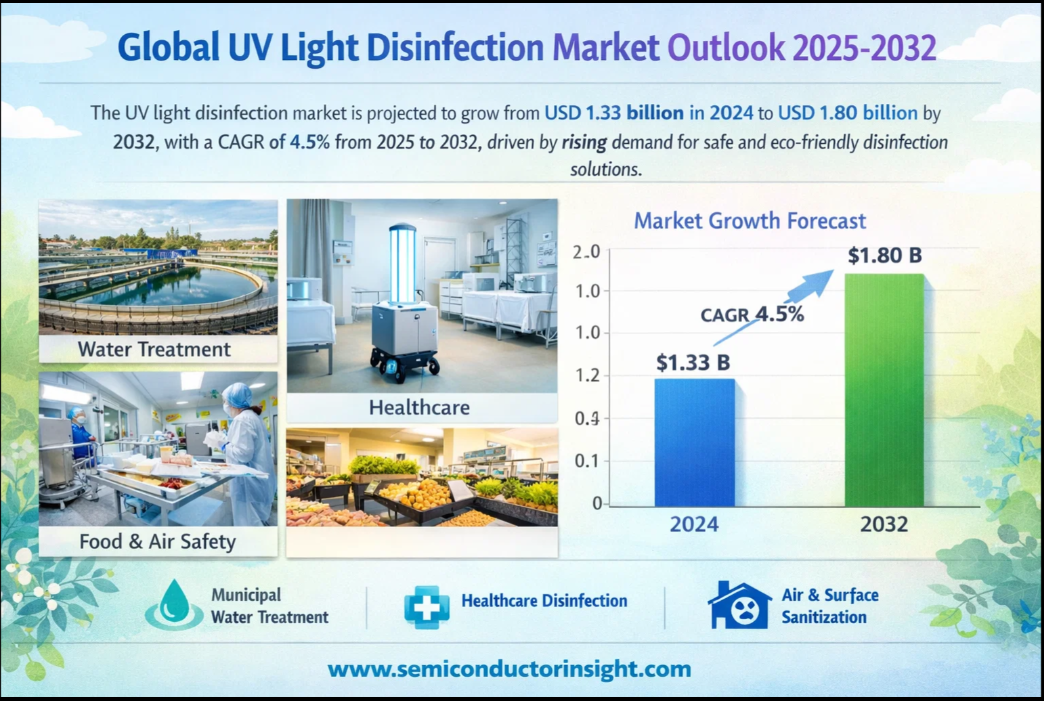 Global UV Light Disinfection Market, valued at a substantial USD 1.33 billion in 2024, is set for a period of steady growth, projected to reach USD 1.80 billion by 2032. This progression, reflecting a compound annual growth rate (CAGR) of 4.5% from 2025 to 2032, is detailed in a comprehensive new report from Semiconductor Insight. The study underscores the essential function of this non-chemical disinfection technology in safeguarding public health and ensuring safety across water, air, and surface applications.