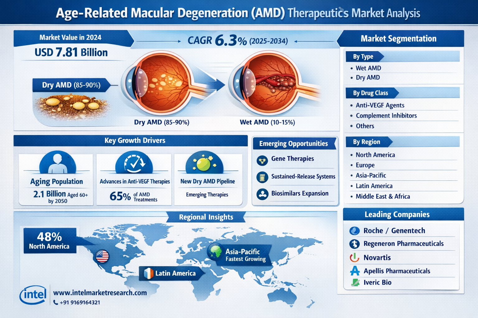 - North America: Dominates the global market with 48% share, driven by high treatment adoption, advanced healthcare infrastructure, and favorable reimbursement policies (Medicare covers AMD therapies)