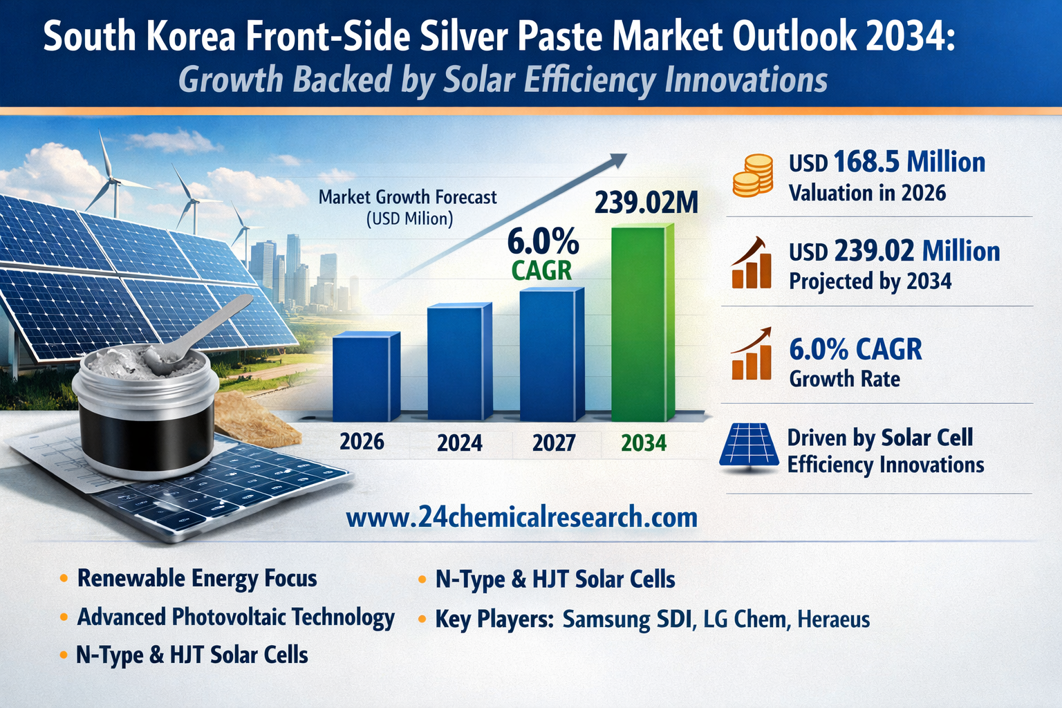 South Korea Front-side Conductive Silver Paste Market has demonstrated remarkable growth, with its valuation reaching USD 168.5 million in 2026. According to recent market analysis, the industry is projected to expand at a CAGR of 6.0%, reaching approximately USD 239.02 million by 2034. This steady growth is driven by South Korea's strong focus on renewable energy adoption and advancements in photovoltaic technology, where conductive silver paste plays a crucial role in solar cell efficiency enhancement.