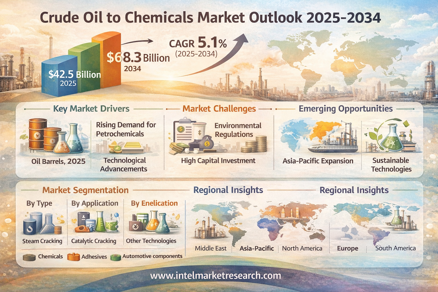 According to a new report from Intel Market Research, the global Crude Oil to Chemicals market was valued at USD 42.5 billion in 2025 and is projected to reach USD 68.3 billion by 2034, growing at a steady CAGR of 5.1% during the forecast period (2025–2034). This growth is driven by rising petrochemical demand, technological advancements in refining processes, and strategic shifts by oil majors toward higher-value chemical production.