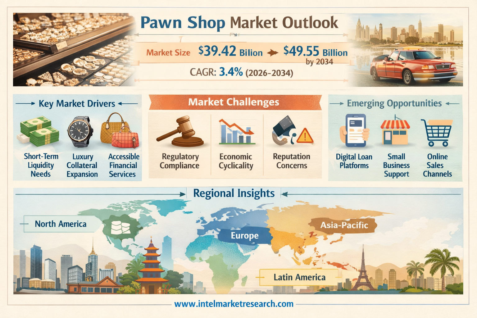 According to a new report from Intel Market Research, the global Pawn Shop market was valued at USD 39.42 billion in 2025 and is projected to reach USD 49.55 billion by 2034, growing at a CAGR of 3.4% during the forecast period (2026-2034). This growth reflects the increasing role of pawn shops as alternative financial service providers amid tightening credit markets worldwide.