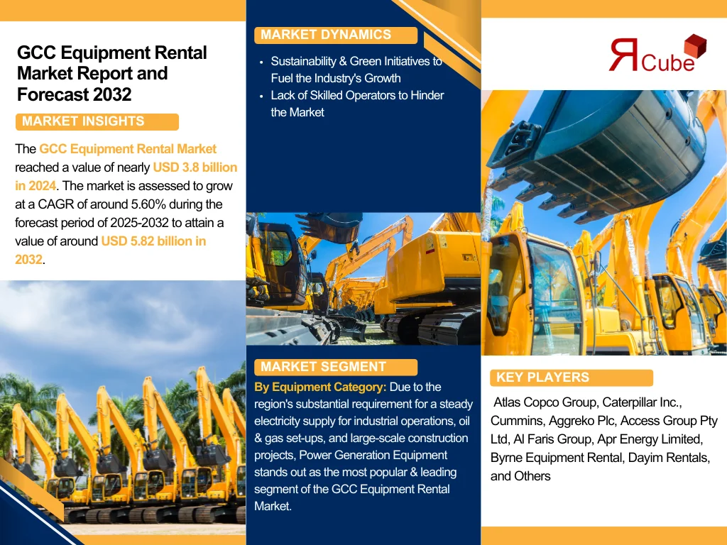 The GCC Equipment Rental Market is projected to grow significantly, reaching USD 5.82 billion by 2032 at a CAGR of 5.60% from 2025 to 2032. This growth is fueled by an increasing demand for industrial and construction equipment, as companies prefer renting over purchasing.