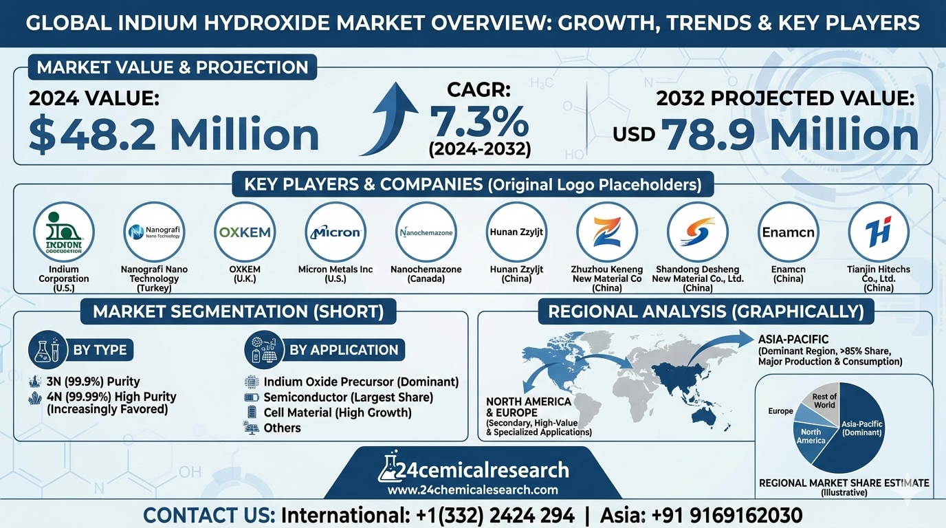 Global Indium Hydroxide market was valued at USD 48.2 million in 2024 and is projected to reach USD 78.9 million by 2032, exhibiting a solid CAGR of 7.3% during the forecast period.