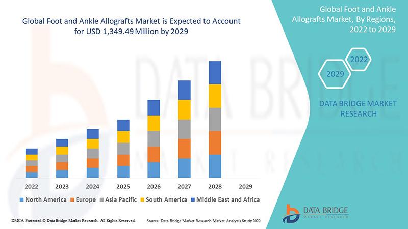 Foot and ankle allografts market is expected to gain market growth in the forecast period of 2022 to 2029. Data Bridge Market Research analyses that the market is growing with a CAGR of 9.3% in the forecast period of 2022 to 2029 and is expected to reach USD 1,349.49 million by 2029 from USD 648.05 million in 2021.