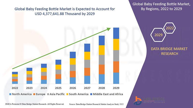 Global baby feeding bottle market is expected to gain market growth in the forecast period of 2022 to 2029. Data Bridge Market Research analyses that the market is growing at a CAGR of 5.8% in the forecast period of 2022 to 2029 and is expected to reach USD 4,377,641.88 thousand by 2029.