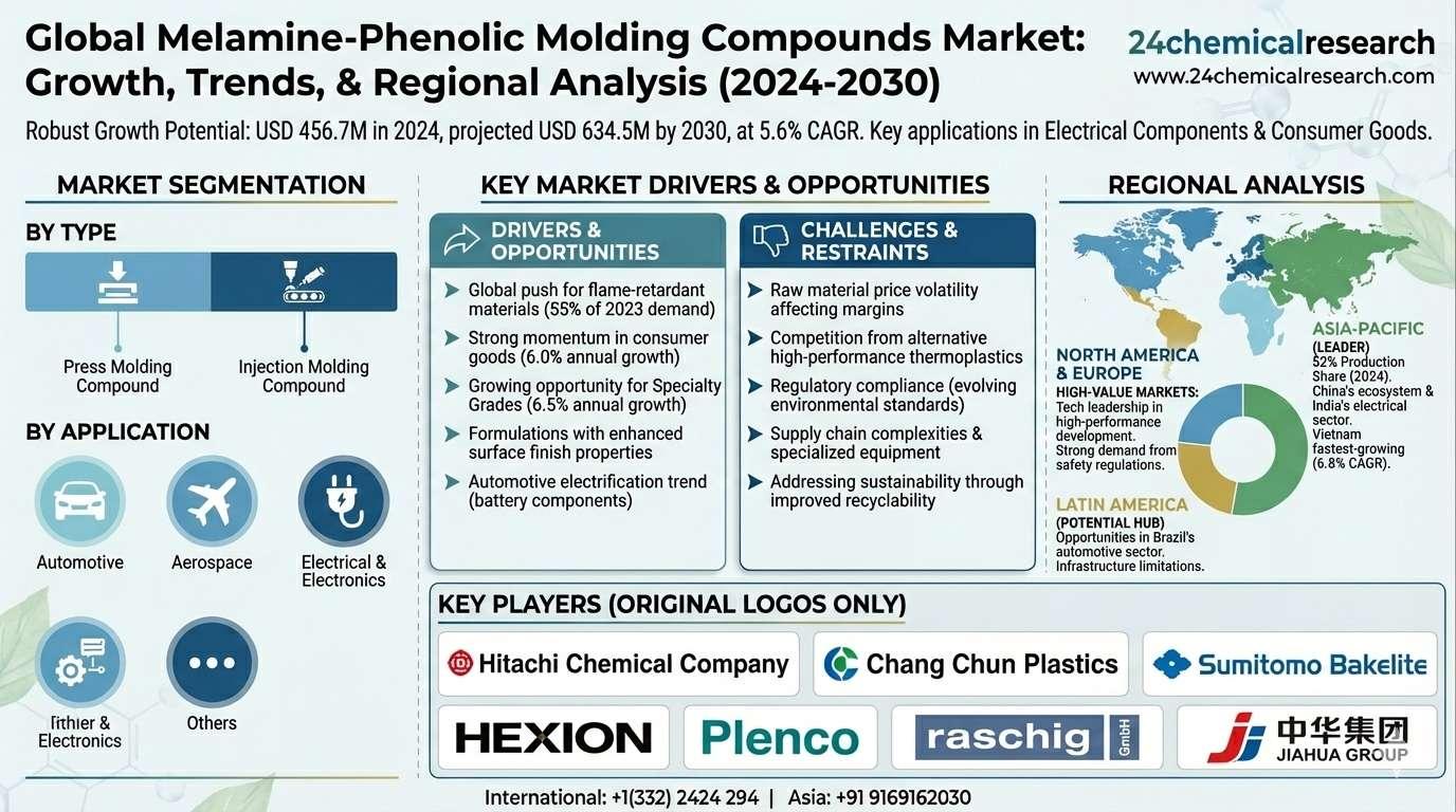 Global Melamine-Phenolic Molding Compounds Market demonstrates robust growth potential, with its valuation estimated at USD 456.7 million in 2024. According to comprehensive industry analysis, this market is projected to expand at a CAGR of 5.6%, reaching approximately USD 634.5 million by 2030. This steady progression stems from increasing applications across electrical components and consumer goods industries, particularly in regions witnessing rapid industrialization and infrastructure development.
