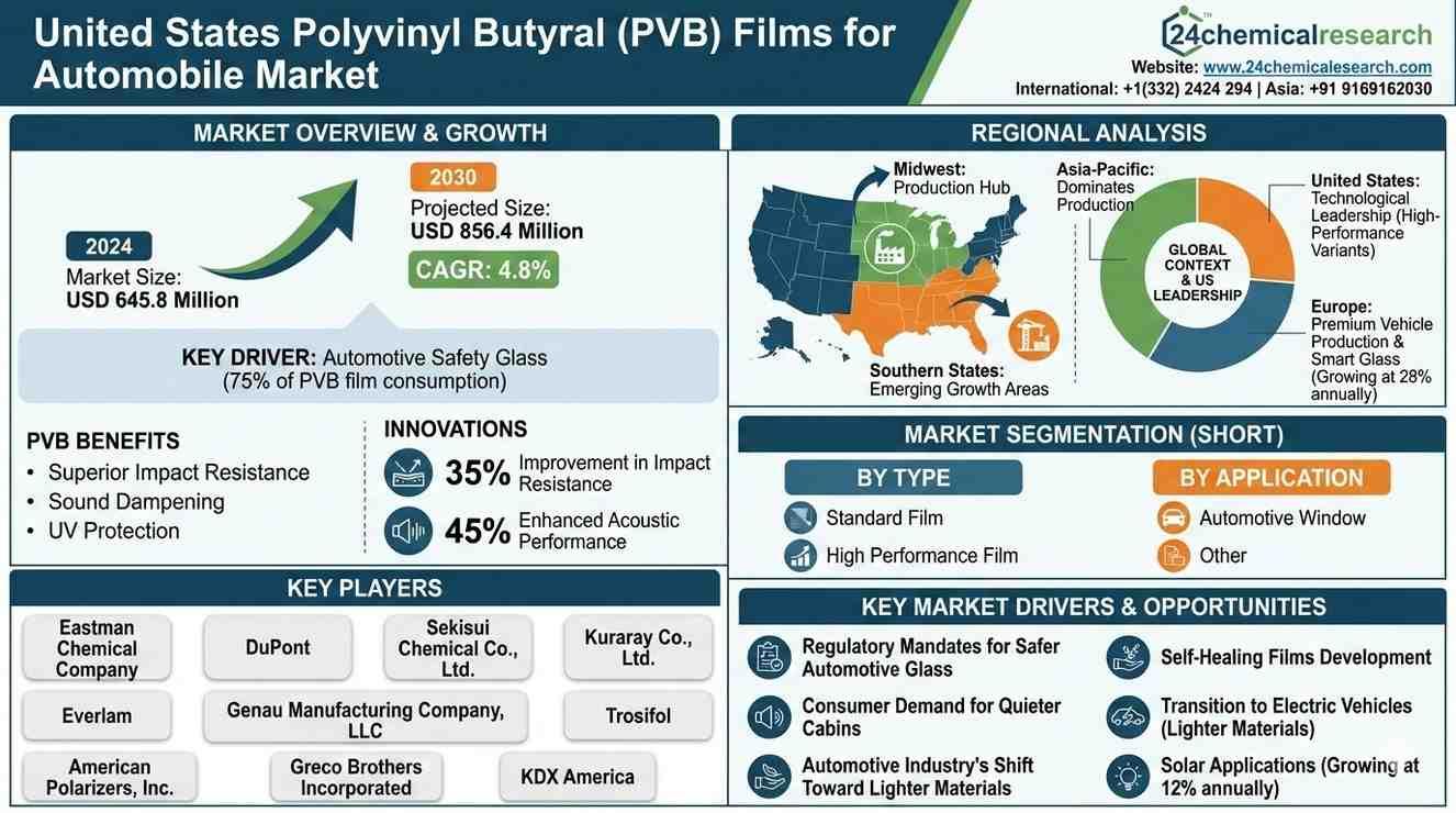 United States Polyvinyl Butyral (PVB) Films for Automobile Market has demonstrated robust growth, reaching USD 645.8 million in 2024. According to industry analysis, the market is projected to expand at a CAGR of 4.8%, reaching approximately USD 856.4 million by 2030. This steady growth is primarily driven by increasing demand for automotive safety glass, which accounts for 75% of PVB film consumption, alongside advancements in material technology.