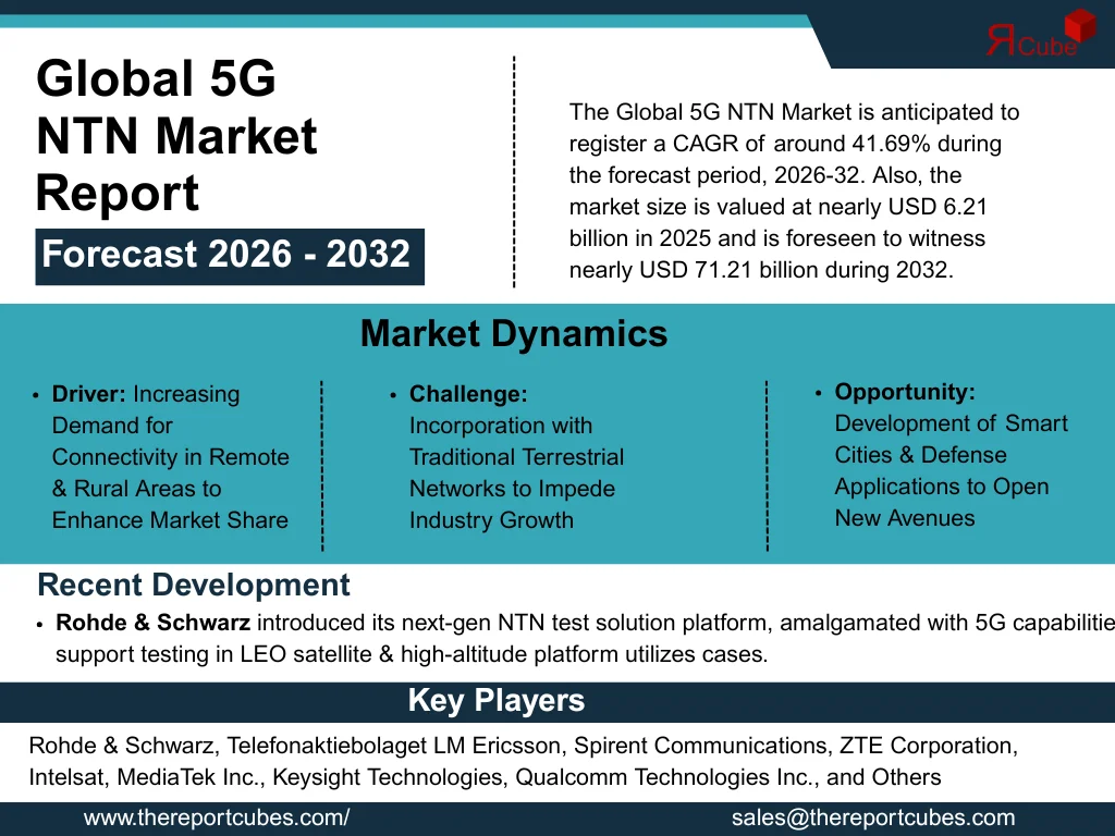 According to The Report Cube latest research study, The Global 5G NTN Market is anticipated to register a CAGR of around 41.69% during the forecast period, 2026-32. Also, the market size is valued at nearly USD 6.21 billion in 2025 and is foreseen to witness nearly USD 71.21 billion during 2032.