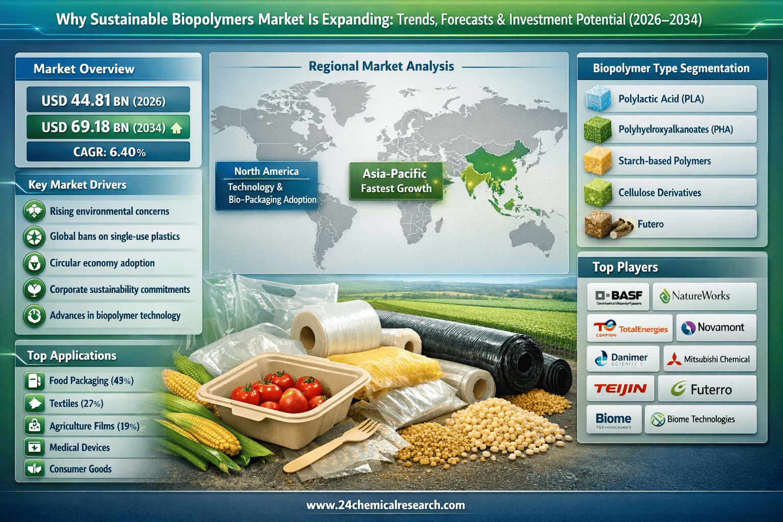 Accordion to 24Chemical Research, Global sustainable biopolymers market demonstrates robust growth momentum, reaching a valuation of USD 44.81 billion in 2026. Industry forecasts project the market will expand at a CAGR of 6.40% through 2034, climbing to approximately USD 69.18 billion. This upward trajectory stems from mounting environmental concerns, stringent regulatory frameworks, and widespread industry transitions toward circular economy principles.