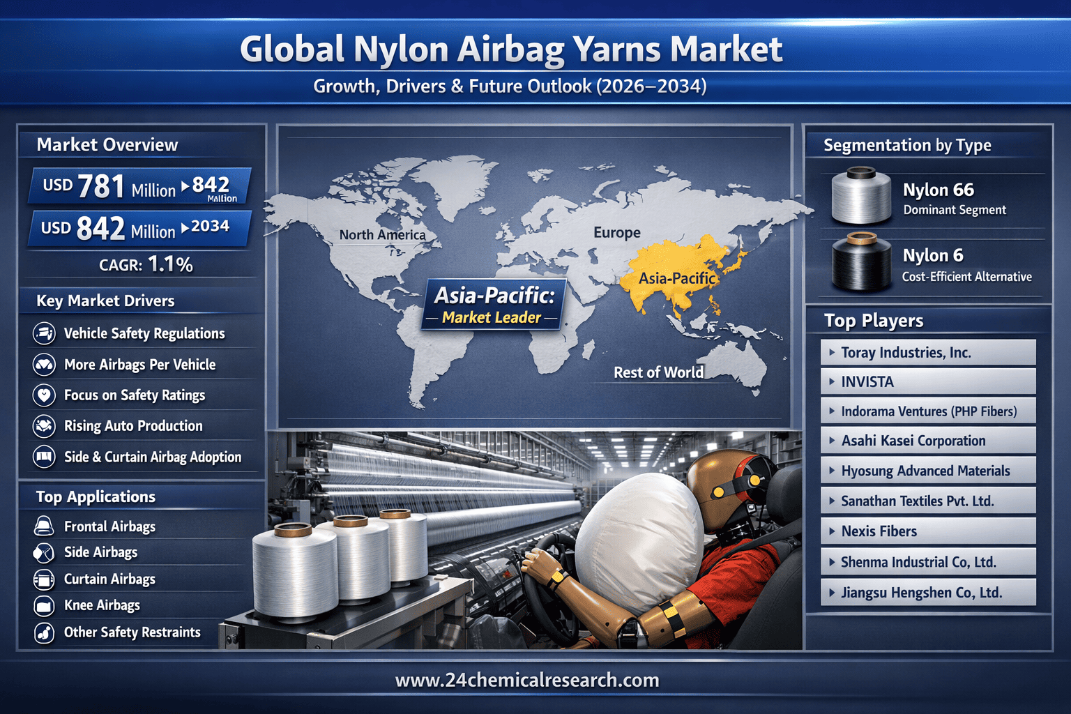 According to 24Chemical Research, Global Nylon Airbag Yarns market was valued at USD 781 million in 2026 and is projected to reach USD 842 million by 2034, exhibiting a steady  CAGR of 1.1% during the forecast period.