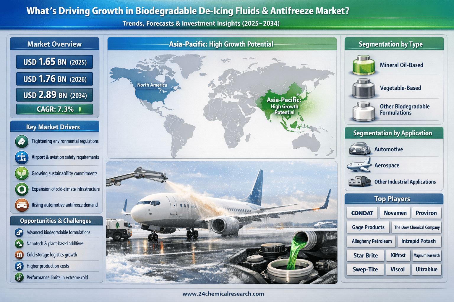 According to 24Chemical Research, Global biodegradable de-icing fluids and antifreeze market size was valued at USD 1.65 billion in 2025. The market is projected to grow from USD 1.76 billion in 2026 to USD 2.89 billion by 2034, exhibiting a CAGR of 7.3% during the forecast period.