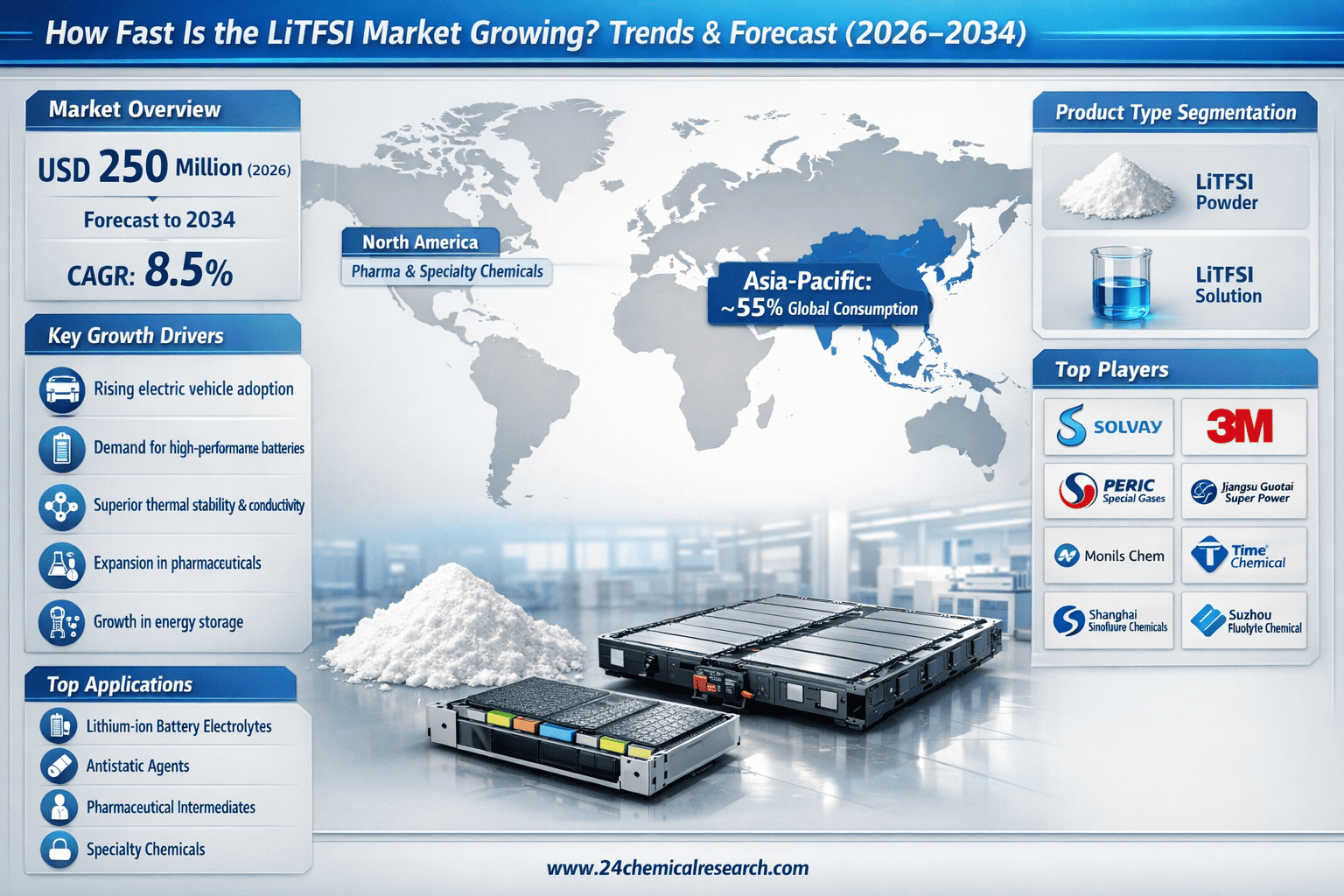 According to 24Chemical Research, Global Lithium bis(trifluoromethanesulfonyl)imide (LiTFSI) market is experiencing significant growth, driven by increasing demand across multiple industries. According to latest market analysis, the sector was valued at USD 250 million in 2026 and is projected to expand at a CAGR of 8.5% through 2034. This growth trajectory is primarily fueled by expanding applications in lithium-ion batteries, pharmaceuticals, and specialty chemicals.