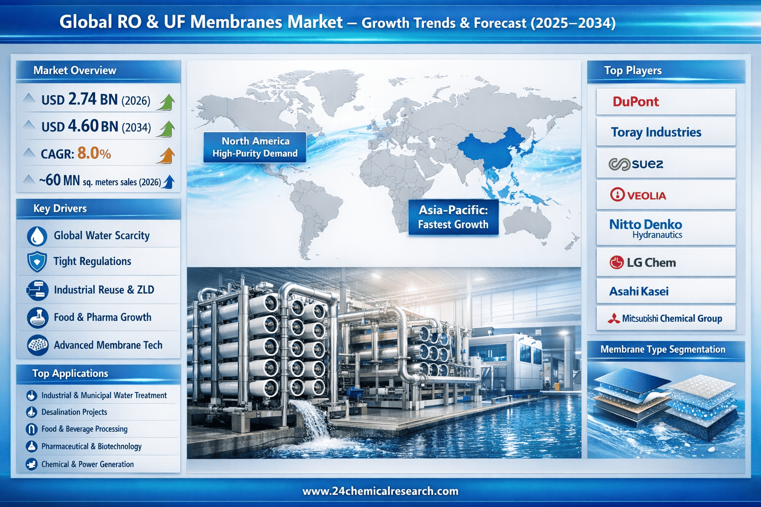 According to 24Chemical Research, Global RO and UF Membranes market was valued at USD 2744 million in 2026 and is projected to reach USD 4601 million by 2034, exhibiting a remarkable CAGR of 8.0% during the forecast period. Global sales of reverse osmosis and ultrafiltration membranes are projected to reach approximately 60 million square meters in 2026.