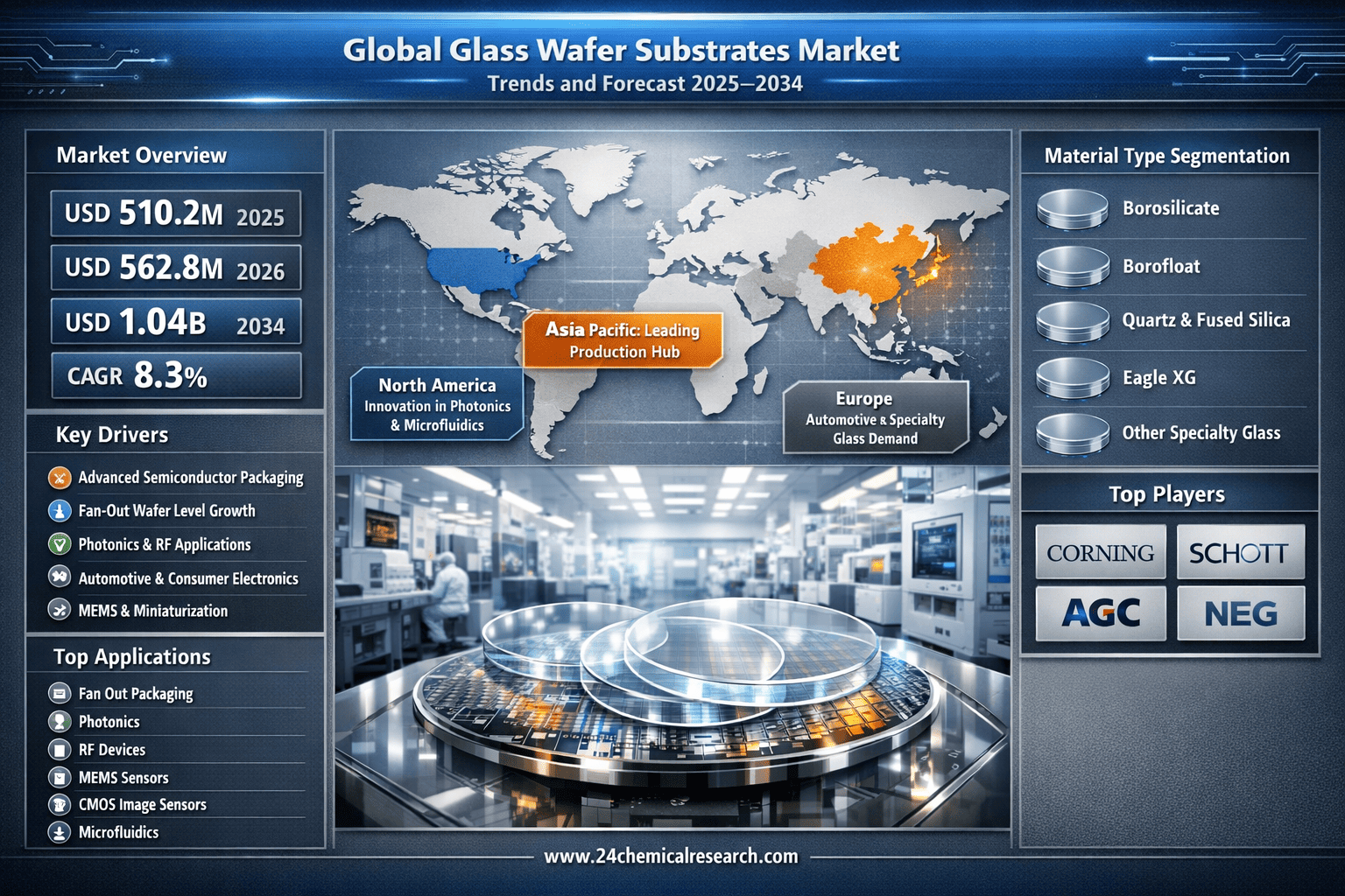 According to 24Chemical Research, Global glass wafer substrates market size was valued at USD 510.2 million in 2025. The market is projected to grow from USD 562.8 million in 2026 to USD 1.04 billion by 2034, exhibiting a CAGR of 8.3% during the forecast period.