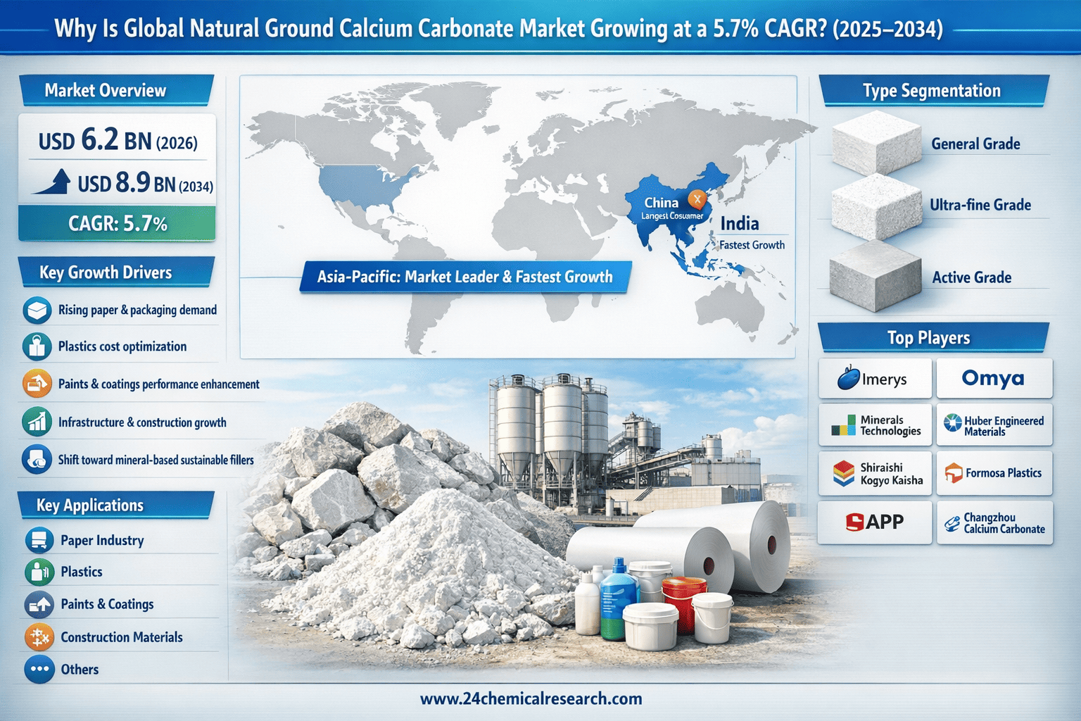 According to 24Chemical Research, Global Natural Ground Calcium Carbonate market continues to demonstrate steady growth, with its valuation reaching USD 6.2 billion in 2026. According to the latest industry analysis, the market is projected to grow at a CAGR of 5.7%, reaching approximately USD 8.9 billion by 2034. This sustained expansion is driven by increasing applications across paper, plastics, paints and coatings industries, particularly in developing regions where infrastructure development and industrialization are accelerating.