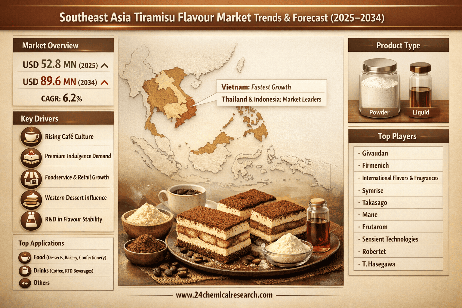 According to 24Chemical Research, Southeast Asia Tiramisu Flavour market was valued at USD 52.8 million in 2025. The market is projected to grow from USD 58.3 million in 2026 to USD 89.6 million by 2034, exhibiting a CAGR of 6.2% during the forecast period.
