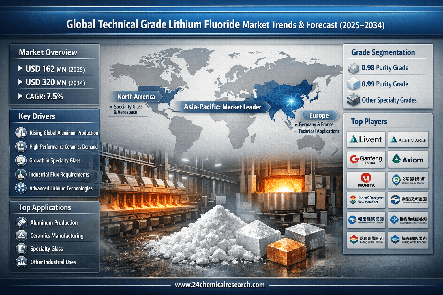 According to 24Chemical Research, Global Technical Grade Lithium Fluoride market size was valued at USD 162 million in 2025. The market is projected to grow from USD 174 million in 2026 to USD 320 million by 2034, exhibiting a CAGR of 7.5% during the forecast period.