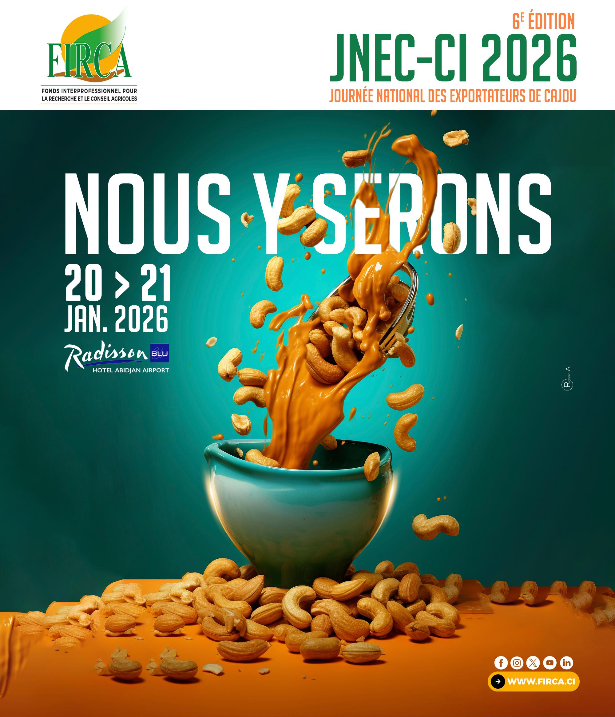Du 20 au 21 janvier 2026 au Radisson Blu d’Abidjan, retrouvez le FIRCA à la 6ᵉ édition des Journées Nationales des Exportateurs de Cajou (JNEC 2026).